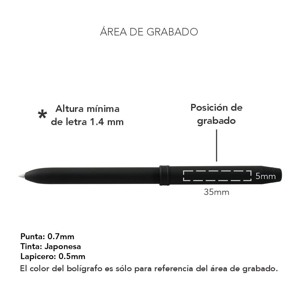 Tinta negra, roja y lapicero de punta 0.5 mm. Incluye borrador con tapa.